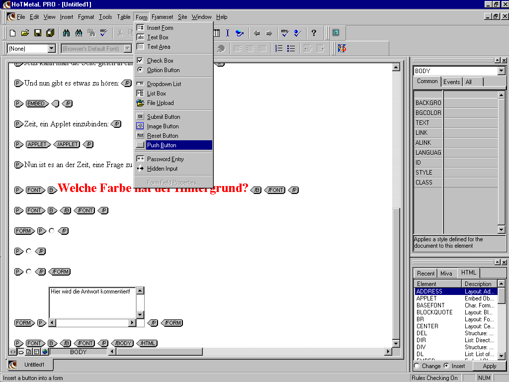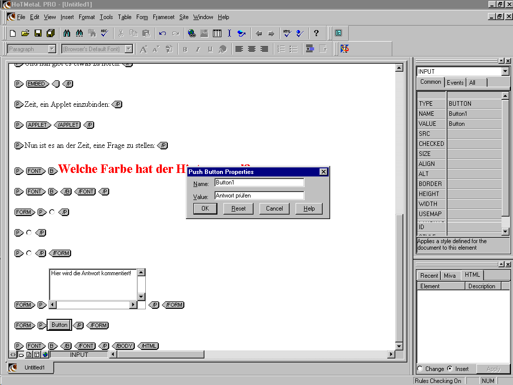 Um die Auswertung starten zu können, wird noch ein Button benötigt. Fügen Sie ihn unterhalb der TextArea ein. (Menü "Form" Befehl "PushButton")![]() Der Button besitzt noch keinen Text. Durch einen Doppelklick auf den Button wird ein Fenster geöffnet, in das Sie bei "Value" als Text "Antwort prüfen" eingeben. Klicken Sie auf "OK". ![]() Damit der Button auch tatsächlich funktioniert, muß er noch mit einem Befehl verbunden werden. Klicken Sie hierzu mit der rechten Maustaste auf den Button. Im erscheinenden Kontextmenü wählen Sie "Attribute Inspector". Dieser wird wieder im Fenster rechts oben angezeigt. Wechseln Sie von der Registerkarte "Common" auf die Registerkarte "Events". Es werden alle verfügbaren EventHandler angezeigt: die Programmiersprache JavaScript, mit deren Hilfe interaktive Elemente auf HTML-Seiten zu Leben erweckt werden, benötigt solche EventHandler zum Aufruf der einzelnen Funktionen. Möglich sind z.B.: ONMOUSEOVER (Wird die Maus über das Objekt bewegt, wird eine Funktion gestartet) oder ONCLICK (wird das Objekt angeklickt, wird eine Funktion ausgelöst). Für unsere Zwecke ist der EventHandler "ONCLICK" zu wählen. Als aufzurufende Funktion geben Sie "auswerten()" an. Diese Funktion wird auf der nächsten Seite noch hinzugefügt. ![]() Weiter geht es auf der nächsten Seite! |
